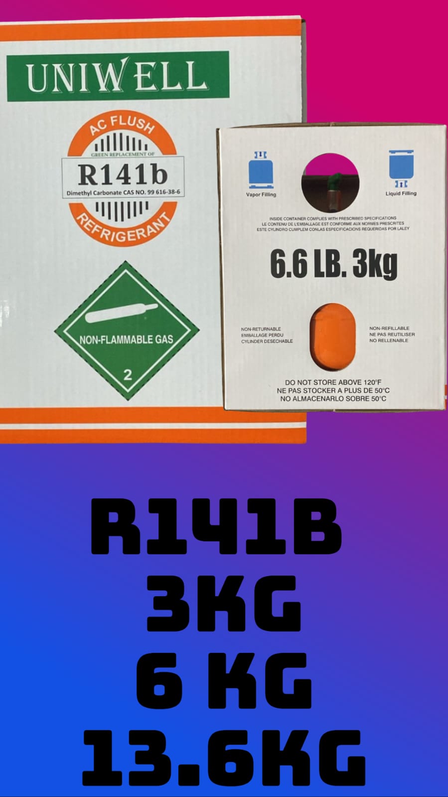 Container of Uniwell AC Flush R141b Refrigerant Replacement Gas.